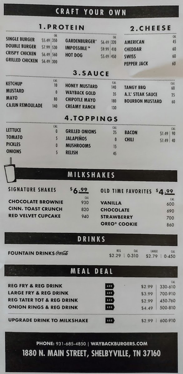 Wayback Burgers, nestled in Shelbyville, TN, offers a classic American fast-food experience with a focus on handcrafted hamburgers that set it apart. The menu highlights include customizable "craft your own" burgers, allowing guests to tailor their meals with fresh toppings—the Big Easy burger and the Impossible Melt are popular choices. Customers rave about the perfectly cooked, crispy French fries and the flavorful chili cheese fries, alongside savory onion rings that complement each burger well. The thick, creamy chocolate milkshakes add a nostalgic touch, rounding out the meal.